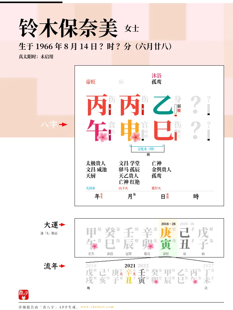 鈴木保奈美のこの「婚変」、実は八字から見ると非常にシンプルなパターンの表れです。まず、彼女の八字原局では「傷官見官」(月令正官が多くの食神、傷官に囲まれている)を犯しており、女性にとっては結婚に不利(古人は「克夫」と言います)。次に、現在の運行が「寅」であり、「寅巳申三刑」を犯し、「夫妻宮」(日支「巳」)に刑を入れて「孤鸞煞」を兼ねています。そして、2020年の庚子年、2021年の辛丑年は、流年「庚」、「辛」が夫星として現れるため、彼女自身にも「婚外情」があった可能性があります。