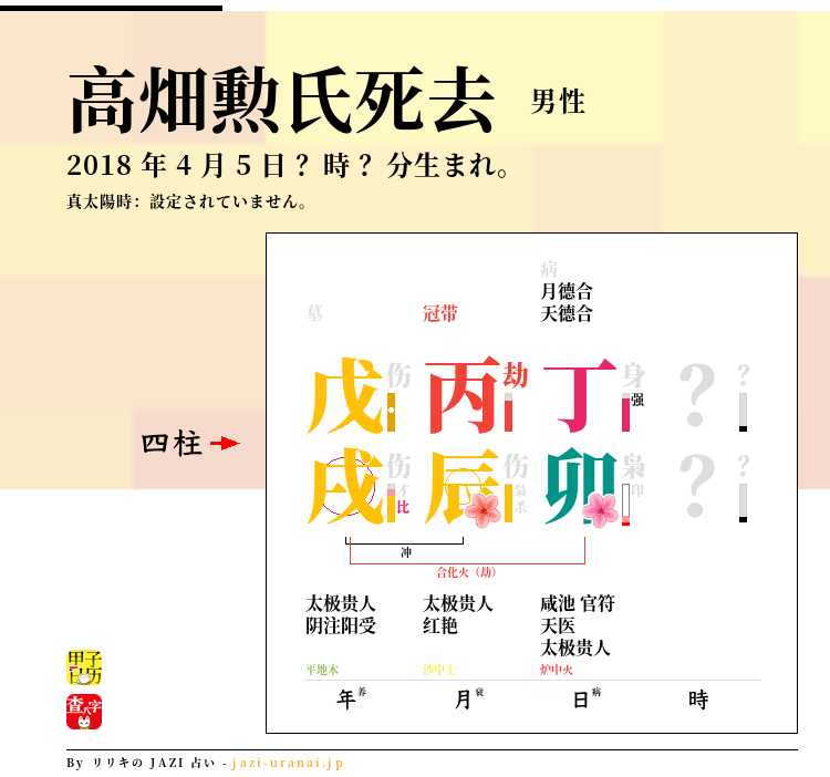 2012年、高畑勲は「戊寅」運に入りました。この運は非常に良くなく、「戊寅」は彼の四柱推命の日柱と同じで、「伏吟」に犯しています。