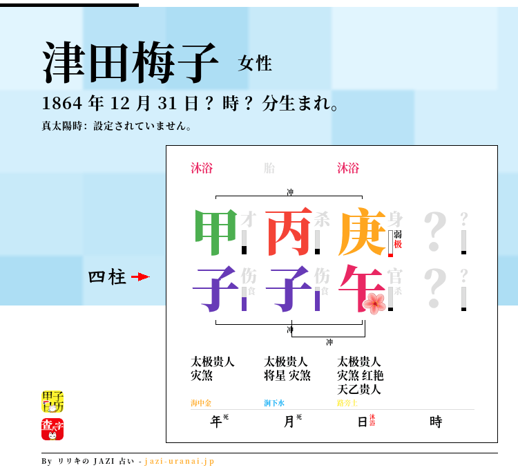 しかし、津田梅子は「伤官生财」や「伤官驾杀」によって女性教育の創立と推進に成功しましたが、彼女の「伤官见官」と「子午冲」により、個人的な生活において多大な犠牲を払いました。