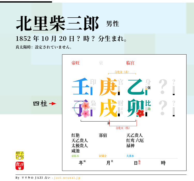 しかし、津田梅子の「伤官见官」と「子午冲」と比べて、涩泽荣一と北里柴三郎の二人の男性の八字には「冲」がなく、むしろ日柱と月柱に「天地鸳鸯合」があります。涩泽荣一は月柱「己卯」と日柱「甲戌」で「甲己合」「卯戌合」を形成し、北里柴三郎は月柱「庚戌」と日柱「乙卯」で「天地鸳鸯合」を形成しています。